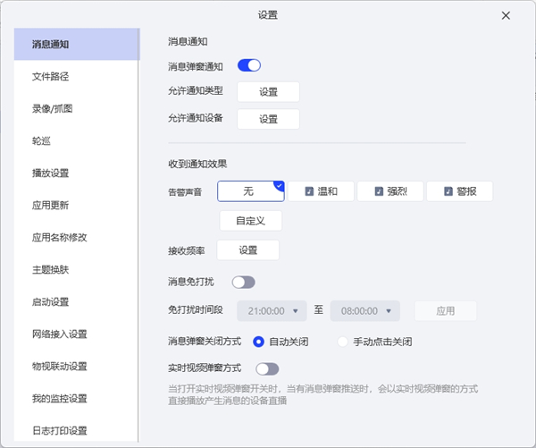 8、实时视频弹窗方式:当打开实时视频弹窗开关时,当有消息弹窗推送时,会以实时视频弹窗的方式直接播放产生消息的设备直播。