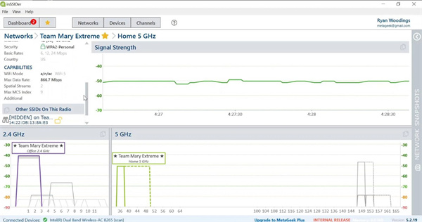 自2007年以来,inSSIDer一直是主要的可视化Wi-Fi工具。你会马上了解你的Wi-Fi网络和邻近的Wi-Fi网络是如何互动的。Inssider向您展示了有关您的Wi-Fi接入点的基本细节,包括频道、频道宽度、信号强度、Wi-Fi生成、最大数据速率和安全性。它还向你展示了邻近的Wi-Fi网络是如何影响你的Wi-Fi的。