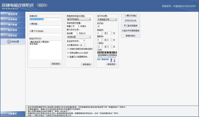 主要就是用来设置便利店收银系统的,在这里可以自定义打印票据中的店铺名称、小票标题和欢迎词。同时可以设置是否每天开机都自动备份,这可以防止因为误操作而导致数据丢失的情况。同时还可以设置库存小于多少自动提醒,积分比例的设置,多少元可以兑换多少积分。