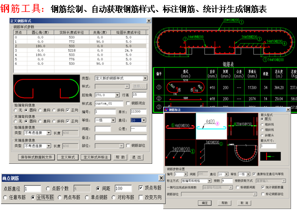 3、 钢筋图软件包(钢筋绘制、标注、自动生成钢筋表材料表,图、表可关联修改)。