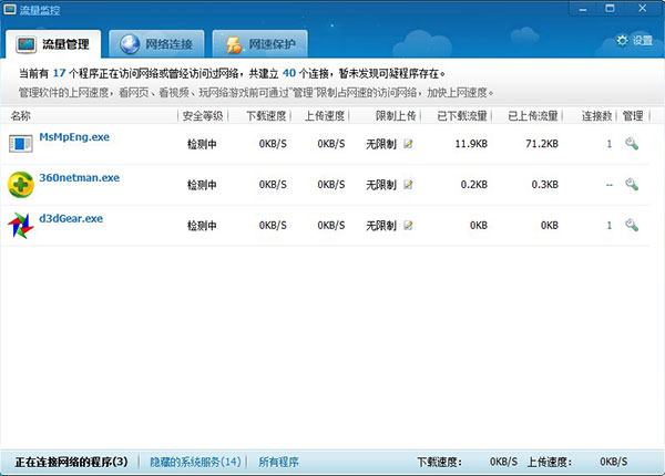 360流量监控独立版是一款从360安全卫士里直接提取出来的一个独立的流量监控工具,借此用户无需安装360安全卫士即可独立运行。该工具适用于本机没有安装360的用户,如果用户已安装则可不再需要本软件,因为360已自带,虽然该软件用户可继续使用,但软件会提示无法开启流量防火墙等提示,而出现这种原因则调用的驱动和您电脑中的360所调用的是同一样的,因为一台电脑不可能同时在两个不同的地方有两个相同的驱动,所以就会造成这样的错误提示。360流量监控独立版拥有流量管理、网络连接、网速保护三大模块功能,其中流量管理可管理电脑上所有软件的上网速度,在用户看网页、看视频、玩网络游戏前用户都可通过该管理来限制占网速的访问网络,并以此可加快上网速度;网络连接可显示当前网络的所有连接;网速保护可允许用户自行设置需要保护的网速。