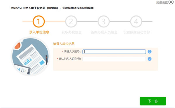 在纳税人识别号,确认纳税人识别号的位置输入扣缴单位的纳税人识别号,已进行过三证合一的单位则输入统一社会信用代码,点击【下一步】,即可完成注册的第一步。