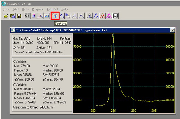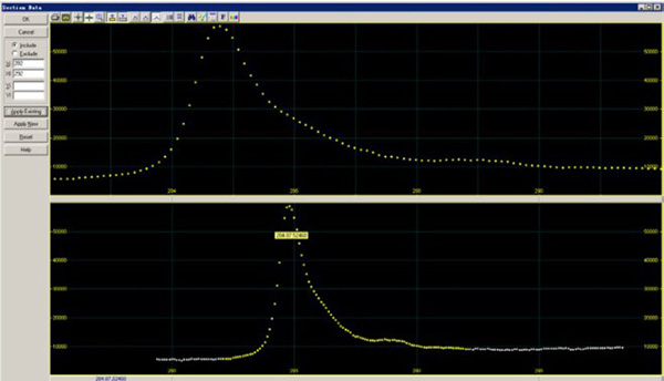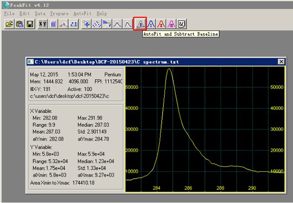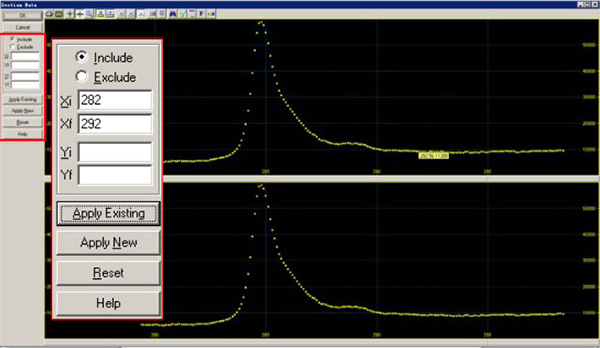 2、在左侧界面中输入适当的“Xi”和“Xf"值,尽量让谱峰位于图中正中位置,点击“ApplyExisting” ;