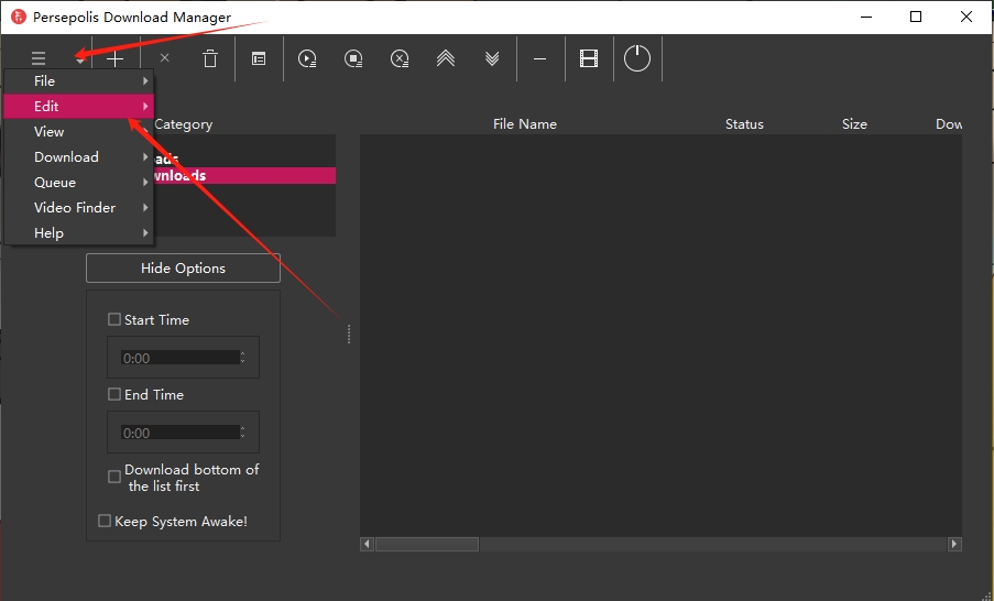 1、点击Persepolis Download Manager左上角的设置菜单按钮,选择【Edit】-【Preferences】。