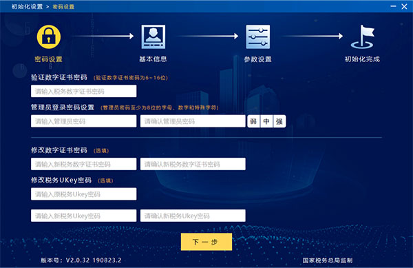 1、安装软件后,双击桌面生成的快捷方式图标。进入系统界面,弹出税务UKey密码输入框。正确输入税务UKey的密码(初始口令为8个8)后,进入“密码设置”界面。