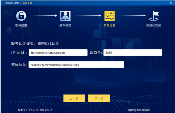 3、正确输入企业基本信息后,点击“下一步”,进入参数设置窗口,默认系统自动配置,纳税人可根据实际情况选择修改与否,经确认无误后,“下一步”即可,如湖北地区电子发票公共服务平台IP 地址为fp.hubei.chinatax.gov.cn,端口为:8899。
