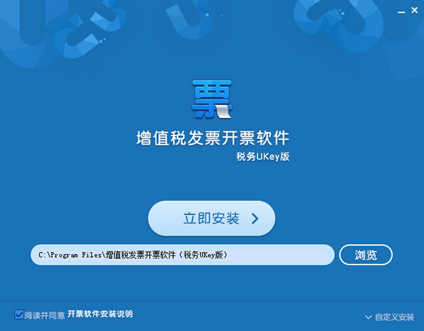 2、默认安装路径为“C:\Program Files\增值税发票开票软件(税务UKey版)”,需要修改安装路径,可以选择上图右下角“自定义安装”,显示如下图所示页面。