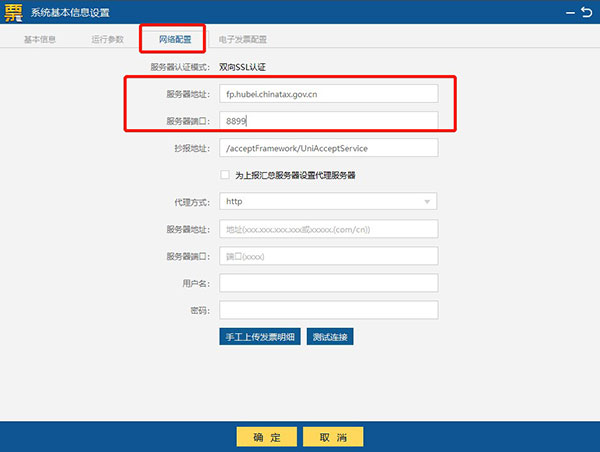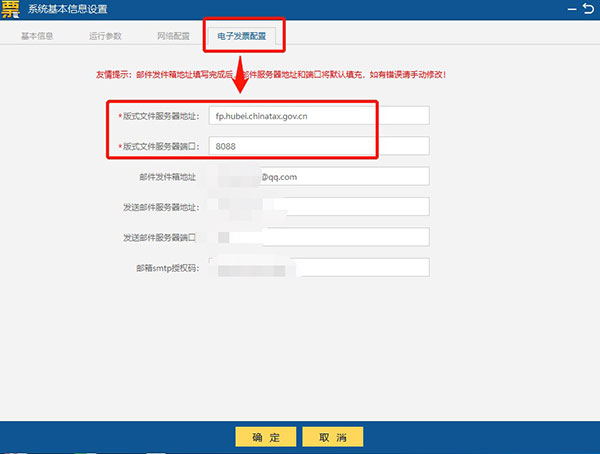 4、点击“系统设置 /系统参数设置/参数设置/电子发票配置”菜单项,弹出电子发票配置项,填入相对应的配置项,点击“确认”按钮。