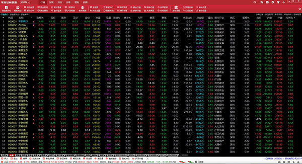 6、在行情页面可以看到各类股票证券的情况总览,上方的菜单栏还有持仓、报价、检测、指数、行情等具体功能,下方可以选择证券分类。