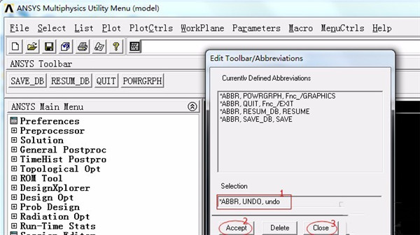 4、然后在界面上会出现一个窗口,我们在窗口下方的文本框中输入“*ABBR,UNDO,undo”,再依次点击“Accept”、“Close”按钮。