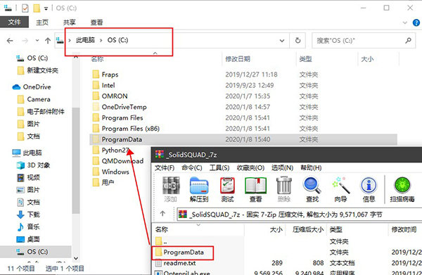 3、软件安装完成后,将_SolidSQUAD_文件解压出来,复制ProgramData到C盘根目录下;