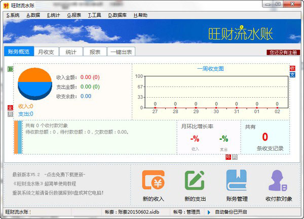 旺财流水账官方版能够方便地管理单位、工程、店面、日常生活等情形下的财务往来。界面简洁,实用至上,可建立多个帐套、无限自定义分类,拥有多种非常强大的图形统计及账务报表,还可以用它来管理应收应付欠款、客户、供应商,使用“一键出表”功能,只需要一次点击,便可生成当前、昨日、上月、去年的多项报表,非常实用。