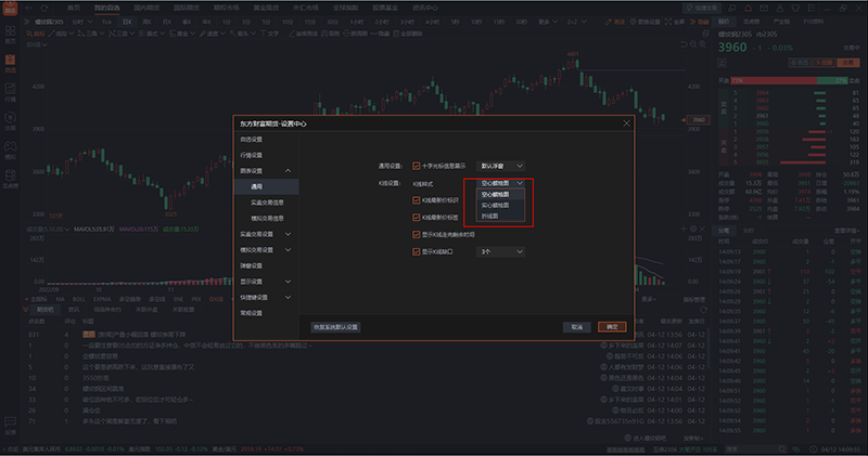 K线样式新增实心蜡烛图、折线图样式,您可根据需要在图表设置-通用中设置体验。