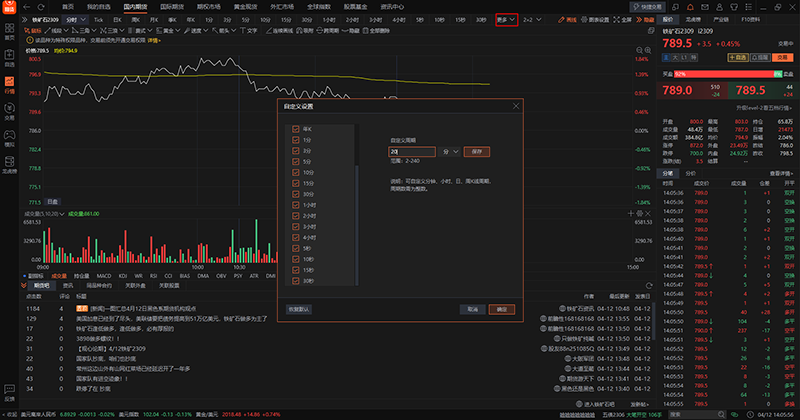 PC端新增自定义周期功能,支持对国内期货周期进行自定义设置。您可在期货详情页的周期选项中单击“更多”,在下拉列表中点击“自定义”按钮进入自定义周期设置弹窗设置您需要的K线周期。