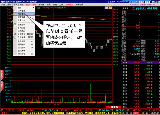 在这里您可以查看任一股票的详细成交状况,我们会将每一笔成交发生时的买卖挂盘变化重现在您的面前。 1、该功能比“分时走势”图更加明细,把当天每一笔成交的记录都清晰地展现出来,内盘外盘一目了然,让您仔细查看该股票的走势状况,不漏掉任何一个细节。
