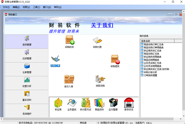 财易仓库管理软件主要分为销售管理,采购管理,仓库管理,基本资料,系统设置(权限管理)五大部分主要功能包括