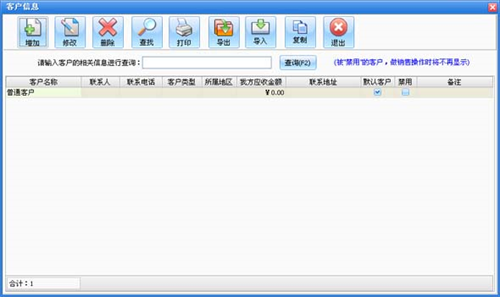 在系统设置模块中点击“客户信息”按钮打开客户信息窗口如图所示。在窗口中可以看到所有的客户。点击“增加”按钮打开增加客户窗口,输入客户的信息,客户名称不能重复。如果该客户有期初金额则在“期初应收”后输入相应金额。如果选择中“默认客户”在商品销售和顾客退货打开窗口的时候显示的为该客户,默认客户只能有一个。