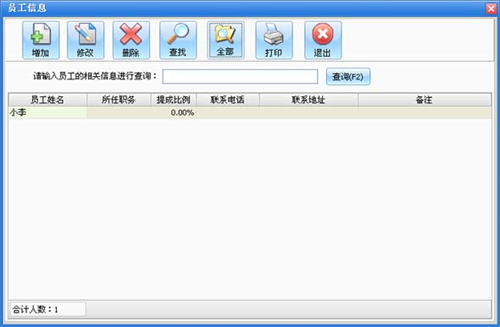 在系统设置模块中点击“员工信息”按钮打开员工信息窗口如图所示。在窗口中可以看到所有的员工。点击“增加”按钮打开增加员工窗口,输入员工的信息,员工名称不能重复。