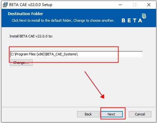 4、选择安装位置,默认路径为“C:\Program Files (x86)\BETA_CAE_Systems\”,建议最好不要安装到系统盘(C盘);