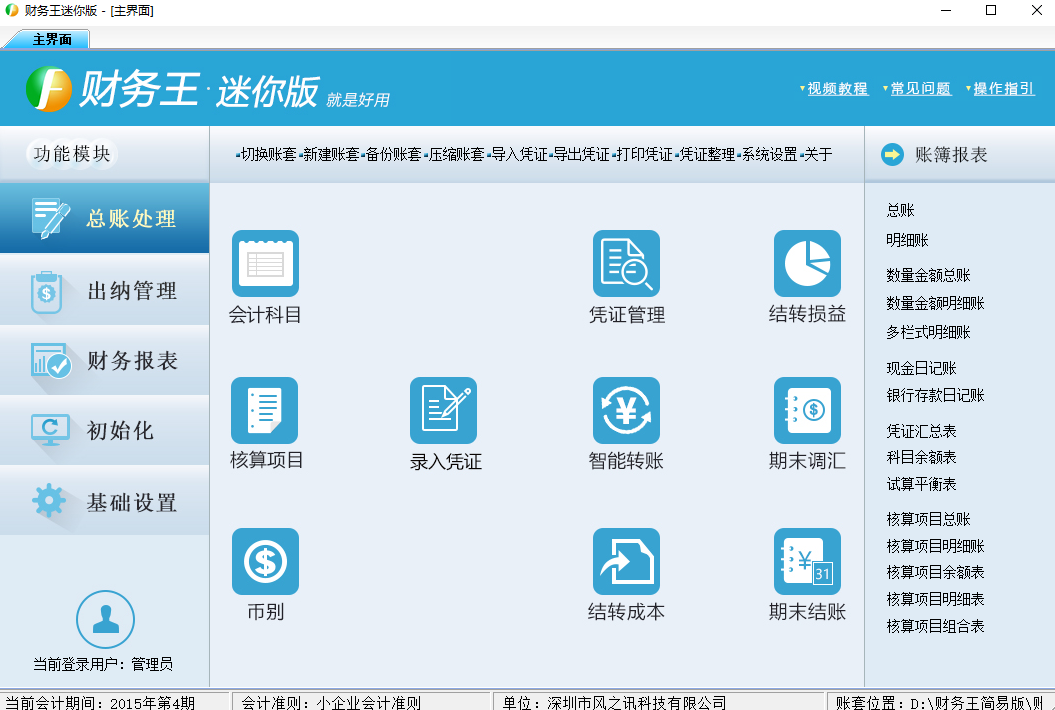 财务王迷你版版提供:会计科目、初始数据、录凭证、查凭证、删改凭证、打印凭证、结转损益、期末结账、期末反结账、导入初始数据、导入科目、导入凭证、凭证整理,审核过账、结转到新账套等主功能。账簿报表包含:总账、明细账、数量金额总账、数量金额明细账、多栏式明细账、凭证汇总表、科目余额表、试算平衡表、资产负债表、利润表和现金流量表。并预设资产负债表、利润表和现金流量表模板。产品状态栏显示【当前会计期间】、【会计准则】、【公司名称】、【账套位置】等信息,查看方便直观。