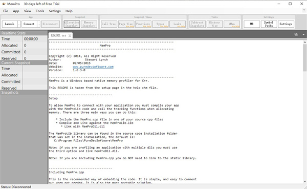 Puredev MemPro官方版是一款功能强大的内存分析工具,帮助用户分析应用程序内存故障或者应用程序开发的内存参数,从而对计算机进行优化,操作简单功能强大。这款软件功能非常的齐全,完美支持Windows系统,能够连接到使用TCP进行分析的应用程序,并记录有关所有分配和整个内存状态的信息,旨在让用户快速高效地工作。与同类型的软件相比,Puredev MemPro软件具有界面直观,操作简单,功能强大等特点,虽然软件运行在Windows平台上,但几乎可以连接到任何平台上的应用程序并对其进行分析。软件在处理大型数据集方面的能力上就c++方面最为突出,只需在几分钟内将MemPro集成到代码库中,用户就能够可以使用MemPro连接到应用程序。而且软件是可以处理大量的数据集,可以每秒跟踪数千个分配,而不会出现明显的速度下降,需要的朋友快来下载使用吧。