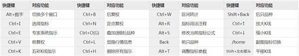 Alt+数字——切换多个窗口 Ctrl+B——后复权 Ctrl+W——区间统计 Shift+Back——后只品种 Ctrl+I——选择指标 Ctrl+N——定点复权 Alt+R——指标用法注释 Ctrl+↑——放大K线