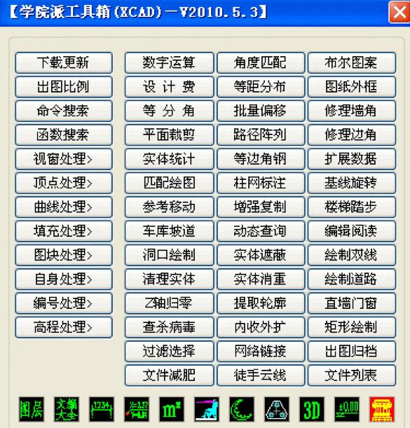 学院派工具箱(xcad)是一款装在AutoCAD上的插件。转上本插件后会更好的进行画图,学院派工具箱(xcad)提供了日常设计时常用的一些线条以及视窗图形,比如一些常用命令修改功能,安装过程也很简单哦,只只需要将压缩包解压到,后加载XCAD.VLX和XYPLib.VLX文件CAD安装目录下,内置工具快捷键列表、自定义简化命令编制说明,是一款辅助的工具。