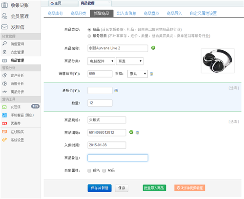 一、商品分类,让条理更清晰 生意专家建议您先对商品进行分类,然后在分类中录入对应的商品名称,这将有助于提升查找速度,缩短管理时间,让您更清晰的看到每类商品的销售情况,盈利情况,合理的调整库存商品配置比例,避免商品积压,加速资金周转,有利提升利润。 二、增加商品,建立完备的商品库,销售记账轻松快捷 通过商品分类的建立,您已经对商品进行了合理的分类,这将有效节约您新增商品的时间。生意专家为您提供了“手动依次录入”和“批量导入”两种方式录入商品。 1、依次录入商品: 点“新增商品",您可以看到如下图所示的界面,录入相关商品信息后,点击“保存并新建”按钮,可以继续录入该分下其他商品。点击“保存”完成录入。如下图所示: