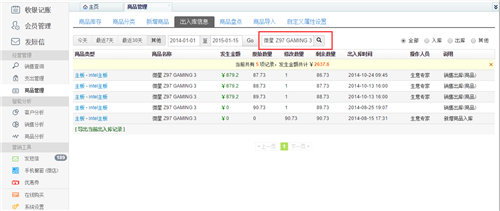 点击“商品管理”——选择“出入库信息”功能,可以查看到所有(删除除外)商品入库和出库的流水记录。同时可以按时间段、按类型、商品名称、大/小分类筛选入库/出库记录,如下图所示: