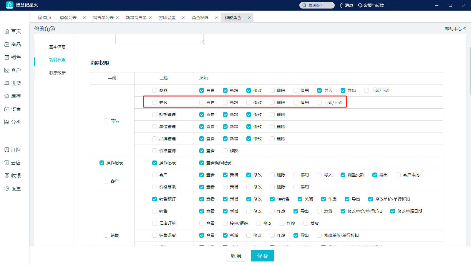 操作路径:【设置】-【角色权限】-【修改】-【功能权限】-【商品】-【套餐】,选择需要的权限。