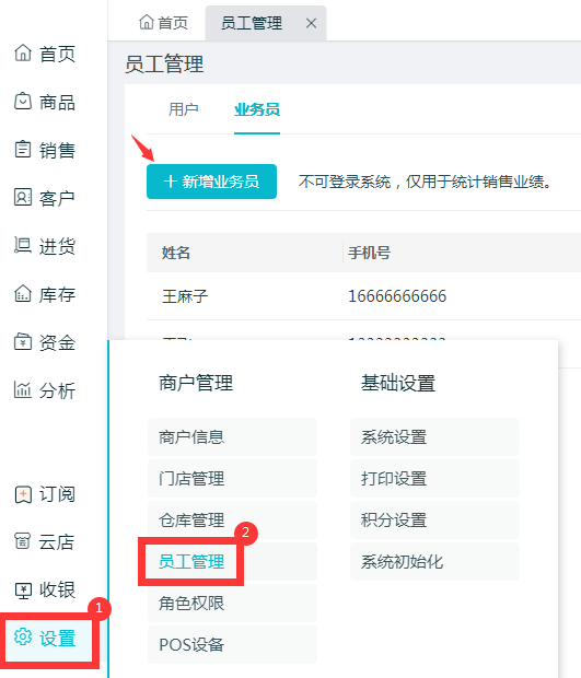 1、新增业务员 路径:电脑端左侧导航栏【设置】-【员工管理】-【业务员-新增业务员】。