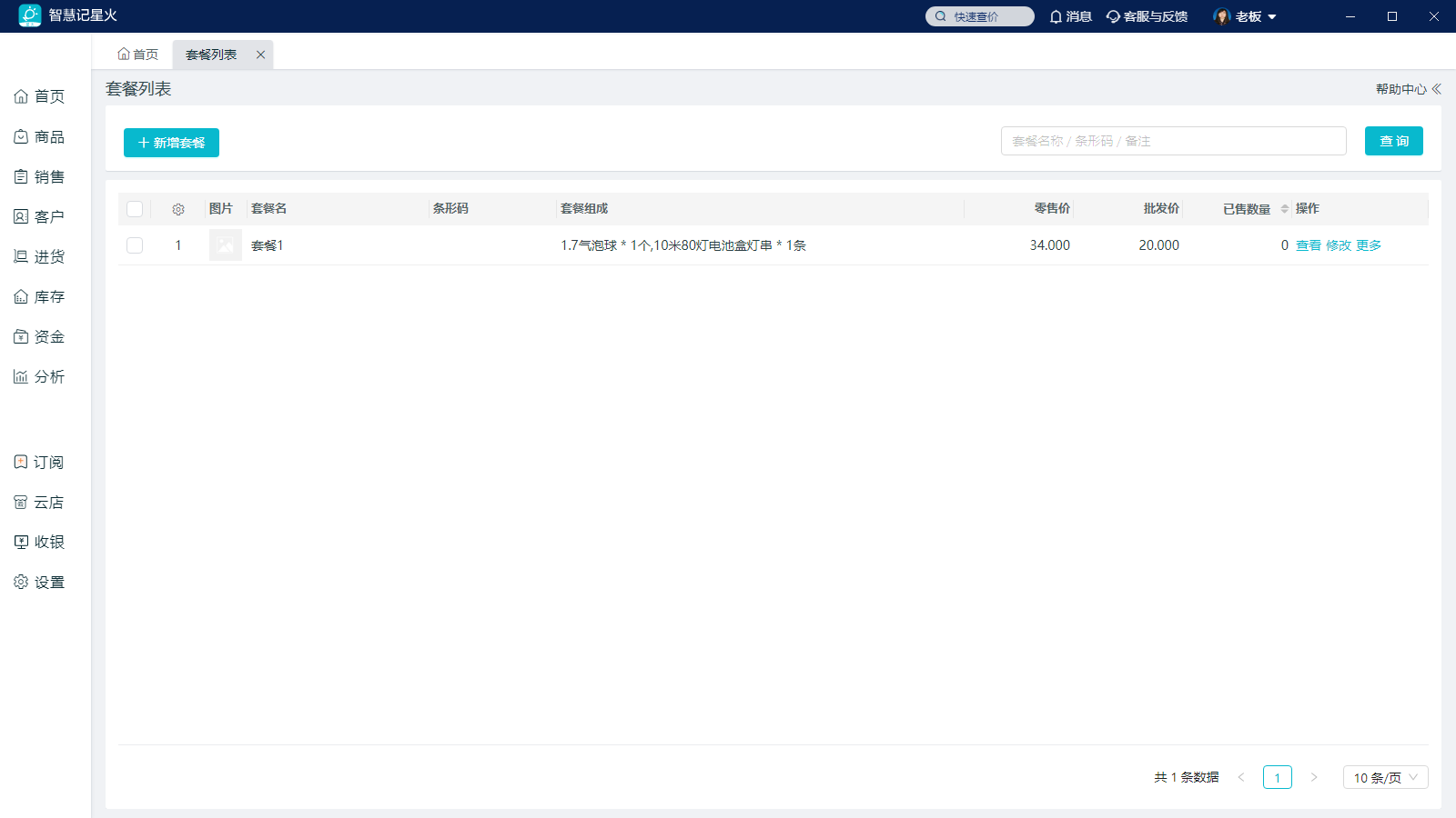 (1)套餐查询:右上角搜索框支持根据套餐名称、条码、备注进行搜索;