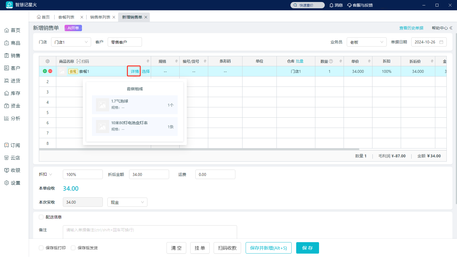 (2)选择数量,库存会直接扣减单据中组成套餐的商品库存。