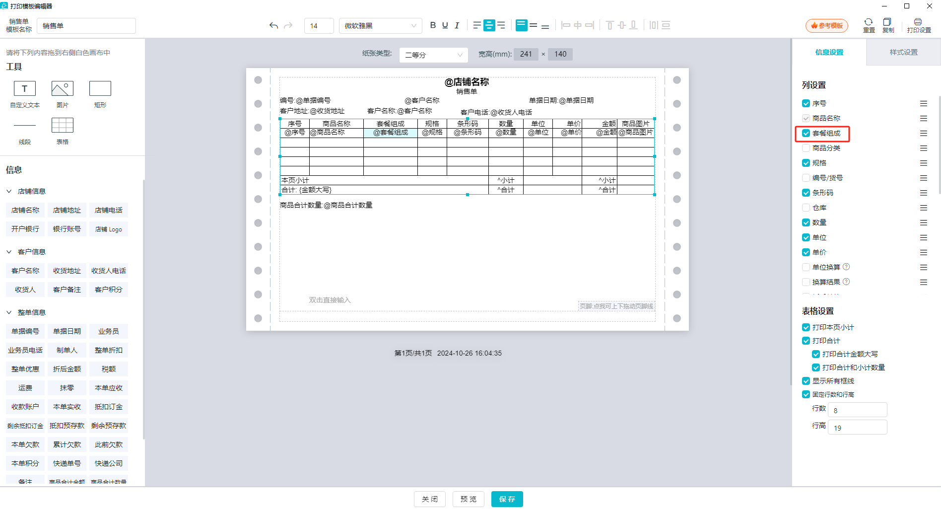 打印模板【表格信息】新增【套餐组成】字段,需要手动勾选。