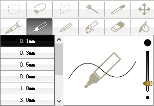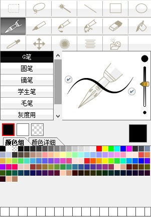 6、用钢笔勾线。 Comic Studio钢笔工具中有好多笔形可供大家选择,这里我是用的G笔勾线,尺寸根据个人喜好自己设定即可。一开始线条总是画不平滑的朋友们,可以根据自己的实际情况设置补正,随着熟练程度的加强,补正的数值可以越来越低,直至最后不用补正也能勾画出流畅有变化的线条。但是,无论你采用何种效果的钢笔勾线,勾线时都务必将右下角的按钮(使显示尺寸影响补正)选上(下图中红色圈住的按钮),否则画出来的线条就都是方块了。