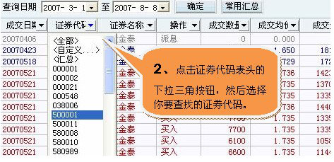 点击过滤后,列表的表头都显示了一个可以下来的三角按钮。点击证券代码表头的下拉三角按钮,弹出所有的证券代码。选择你要查找的证券代码,就可以快速查询到某个股票的所有交易记录。