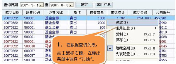 如下图实在查询历史成交界面,右键点击交易记录,在弹出的右键菜单里,选择“过滤”: