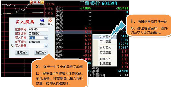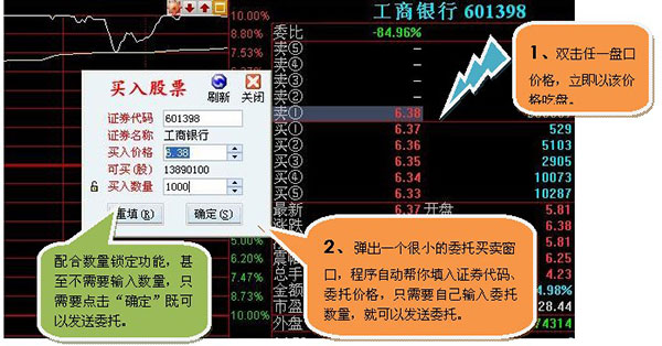点击卖盘,则为买;点击买盘,则为卖。手工输入委托数量。采用这种方式可以实现快速的追买、追卖、扫盘的功能。不用输入证券代码、委托价格,程序自动填单,只需要快速的点击鼠标,就可以实现一笔委托,最快速度可以达到2秒!!!