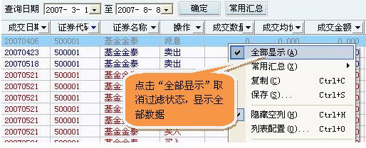 汇总后的显示,显示了总的成交数量、成交均价、成交金额。再次点击右键菜单的“全部显示”则取消汇总状态,显示所有数据。
