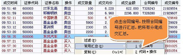 如下图是查询当日成交,点击鼠标右键,选择“汇总”-“按合同编号汇总”,就可以把所有分笔成交进行汇总。