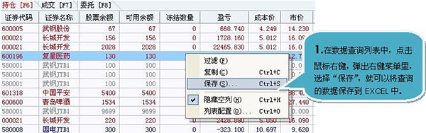 可以将查询结果,如资金查询、股份查询、成交查询等数据导出为文本文件或者EXCEL文件保存。便于您对帐户数据进行备份、或进一步分析。