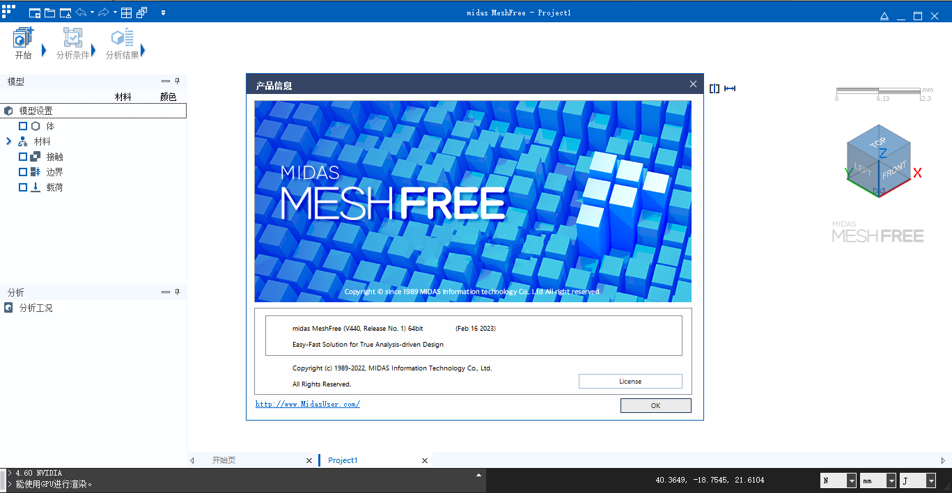 midas MeshFree 2024 R1中文版由MIDAS开发的一款无网格划分仿真分析软件,与传统的仿真分析不同的是,它是基于隐式边界法开发,采用全新无网格划分仿真分析技术,无需考虑CAD模型的复杂性,更无需进行网络划分就能够得到最理想的结果,从而摆脱了当今设计和分析软件的所有困难。除此之外,MeshFree 2024还提供支持中英文切换的人性化界面,整体操作使用非常简单,用户只需三步骤即可完成分析:导入 CAD、输入荷载和边界条件、结果分析,加以功能强大的分析工具和最佳设计技术,包括线性、模态、传热、热应力、疲劳等多种分析功能,利用这些功能特点,分析者可在设计阶段进行高效的工作。