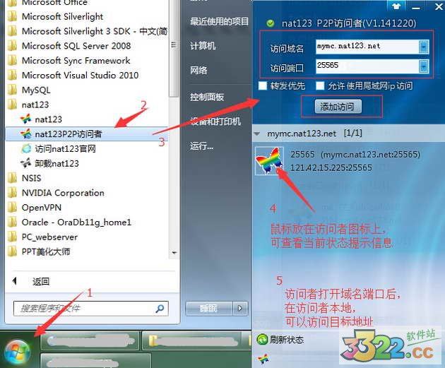 (3)如是全端口映射模式,在联机访问端同样需要安装使用nat123访问者。如是非网站映射模式,联机访问端只需要知道映射后的外网地址和外网端口。