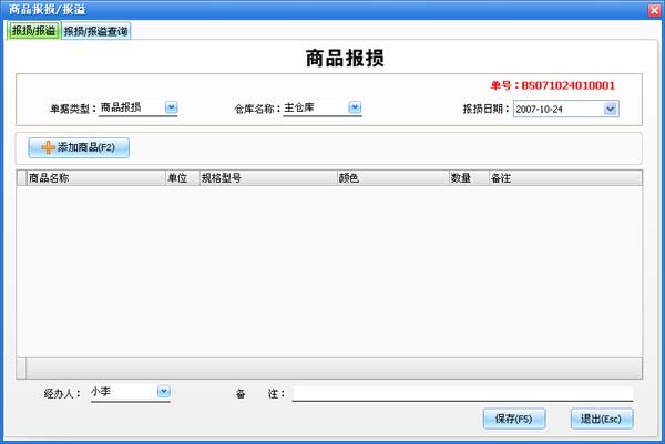 用户按照界面的提示选择或输入各项基本信息,通过在“单据类型”中 选择“商品报损”或“商品报溢”来进行不同的操作。