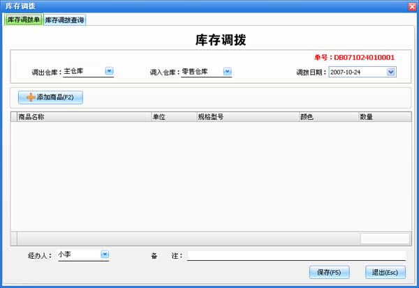 将物品从一个仓库调配到另一个仓库,按照界面的提示进行操作,点击'增加商品'按钮进入'增加商品'窗口,选择要调拨的商品;增加的商品将显示于'增加商品'按钮下的'调拨商品'表格中。 商品添加完成后点击'保存'按钮退出,即完成物品的调拨,已调拨的商品可以查询。