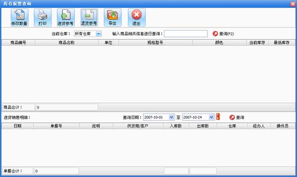 4、库存报警查询 该部分显示库存数量低于系统设定的最低库存的商品。