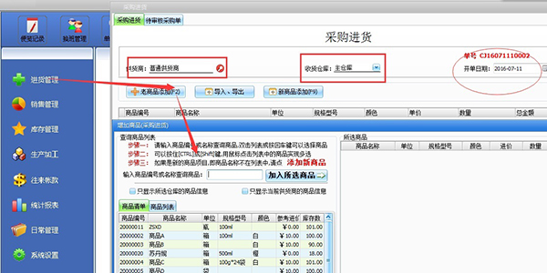 1、采购进货 用户在首页可以点击进货管理,再点击采购进货就可以进入采购进货页面,可以输入供货商以及收货仓库,之后添加自己的进货商品