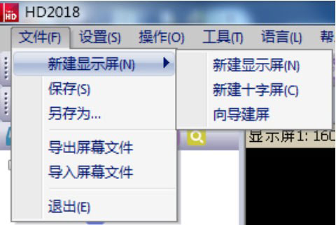 包含新建显示屏、保存、另存为、导出屏幕文件、导入屏幕文件、退出等六个选项,如图: