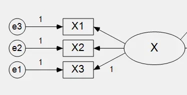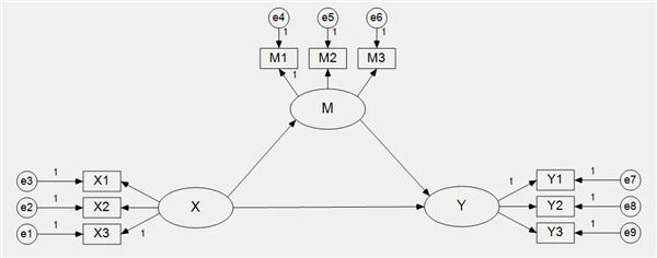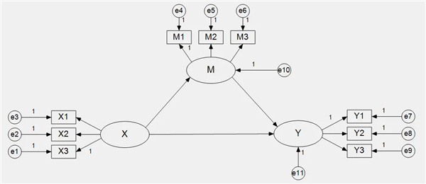 6、现在我们把潜变量之间的关系做一个连线,单箭头就是回归,双箭头就是相关,具体连哪些变量、怎么连,一般都是要相应的理论支撑的。在这个模型里,我预设的是X影响M和Y,M影响Y。连完线如下图所示