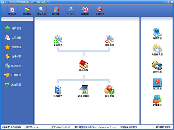1、进货管理:进行商品采购入库、采购退货、进/退单据和当前库存查询、与供货商的往来帐务。 2、销售管理:进行商品销售、顾客退货、销/退单据和当前库存查询、与客户的往来帐务。 3、库存管理:包括库存之间商品调拔、商品的报损溢、强大的库存盘点功能、库存商品报警查询。 4、统计报表:完整的统计查询功能、每张单据每次收款付款都可以清楚的反映。 5、往来账款:管理企业与供货商及企业与客户之间的应收应付款。 6、日常管理:对供货商、客户、业务员综合管理、对日常收入支出管理、合同管理。 7、基本设置:商品信息、供货商、客户、员工、仓库等基本参数的设置。 8、系统维护:可以对数据库备份/恢复、系统初始化、操作员修改密码、年终结算、查看日志。易企用会员进销存系统官方版如何安装